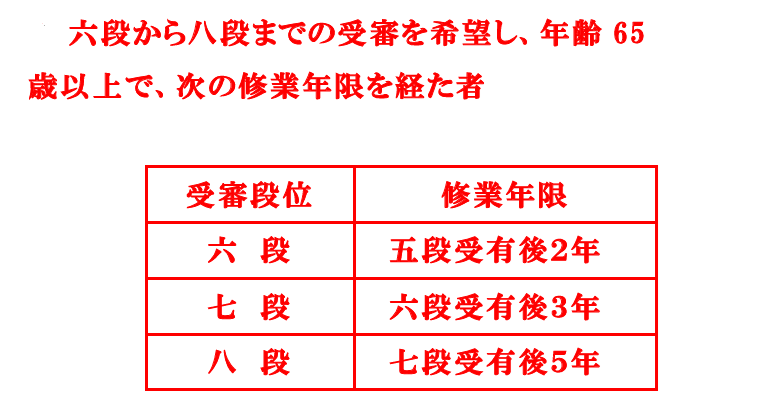 全剣連より六・七・八段審査における、高齢受審者(65歳以上)修業年限短縮処置についてのご案内です。
